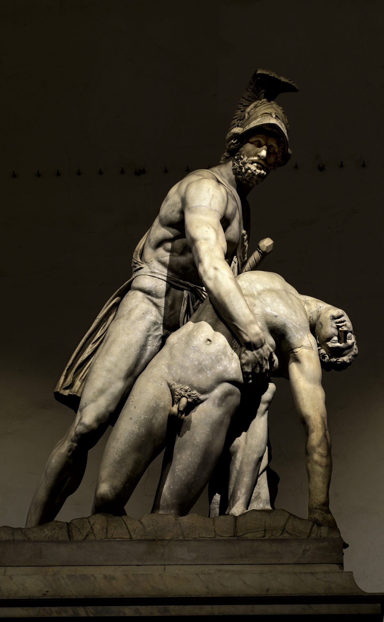 Above: Menelaus supporting the body of Patroclus, Loggia dei Lanzi, Florence, Italy, Roman Marble sculpture of Greek Bronze, c. 200 BCE CC