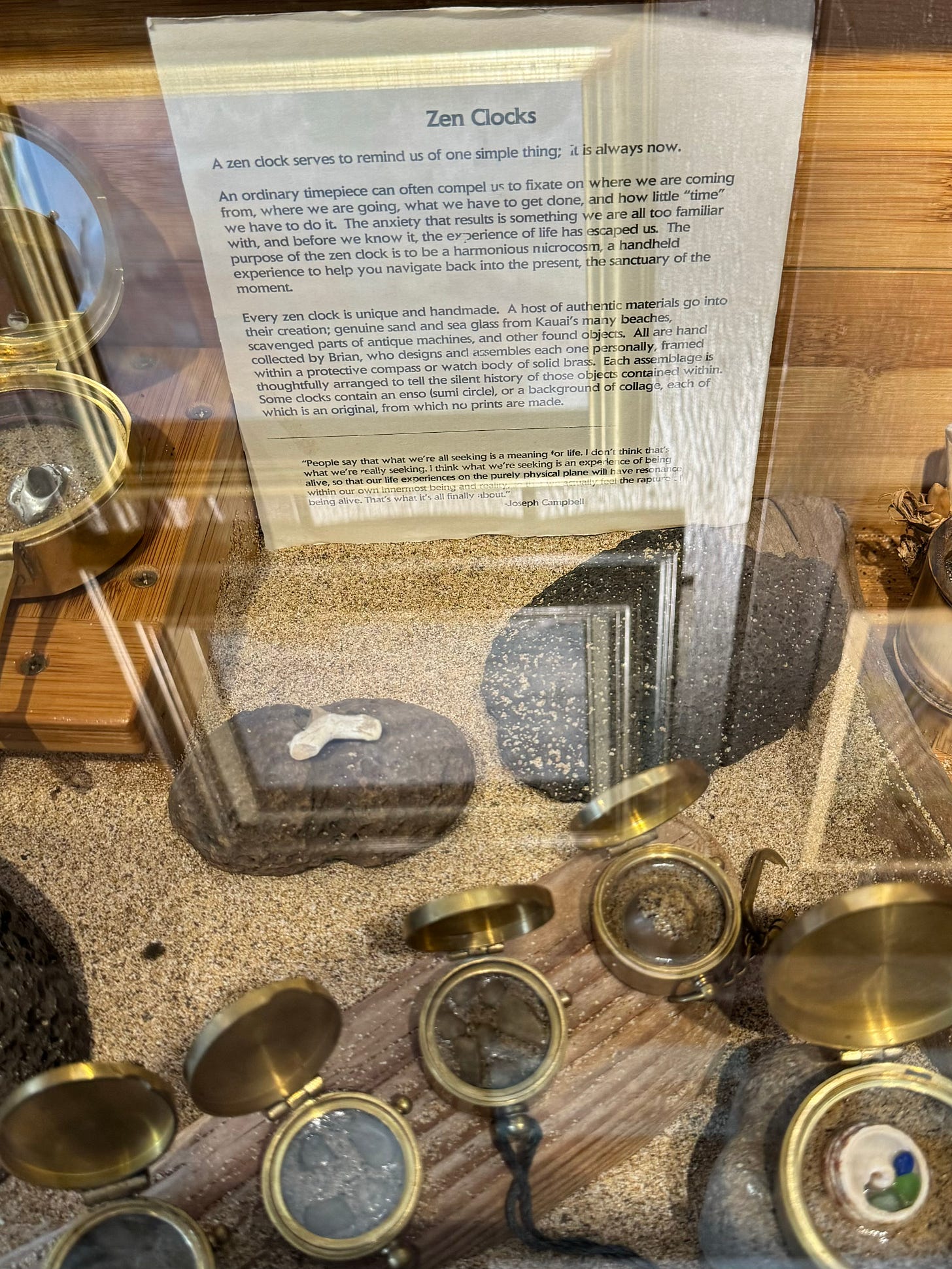 In addition to the several quality art galleries (check open hours, best is Friday night from 5-7), the craft shops are quite nice here, with ceramics, Niihau Shell leis, and creative Knick-knacks such as these Zen Clocks.
