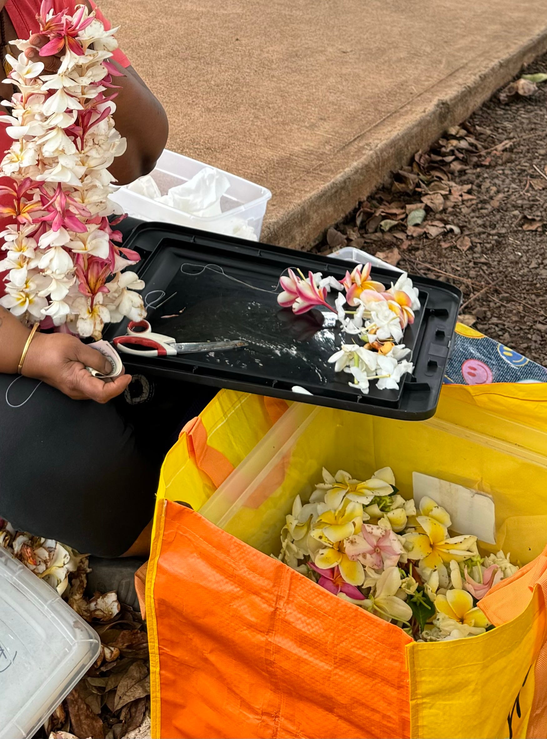 Last night on the way to the swinging bridge a local lady, who didn’t want her picture published (“For your use only please”), was making and selling leis. The price: “whatever you wish.”
