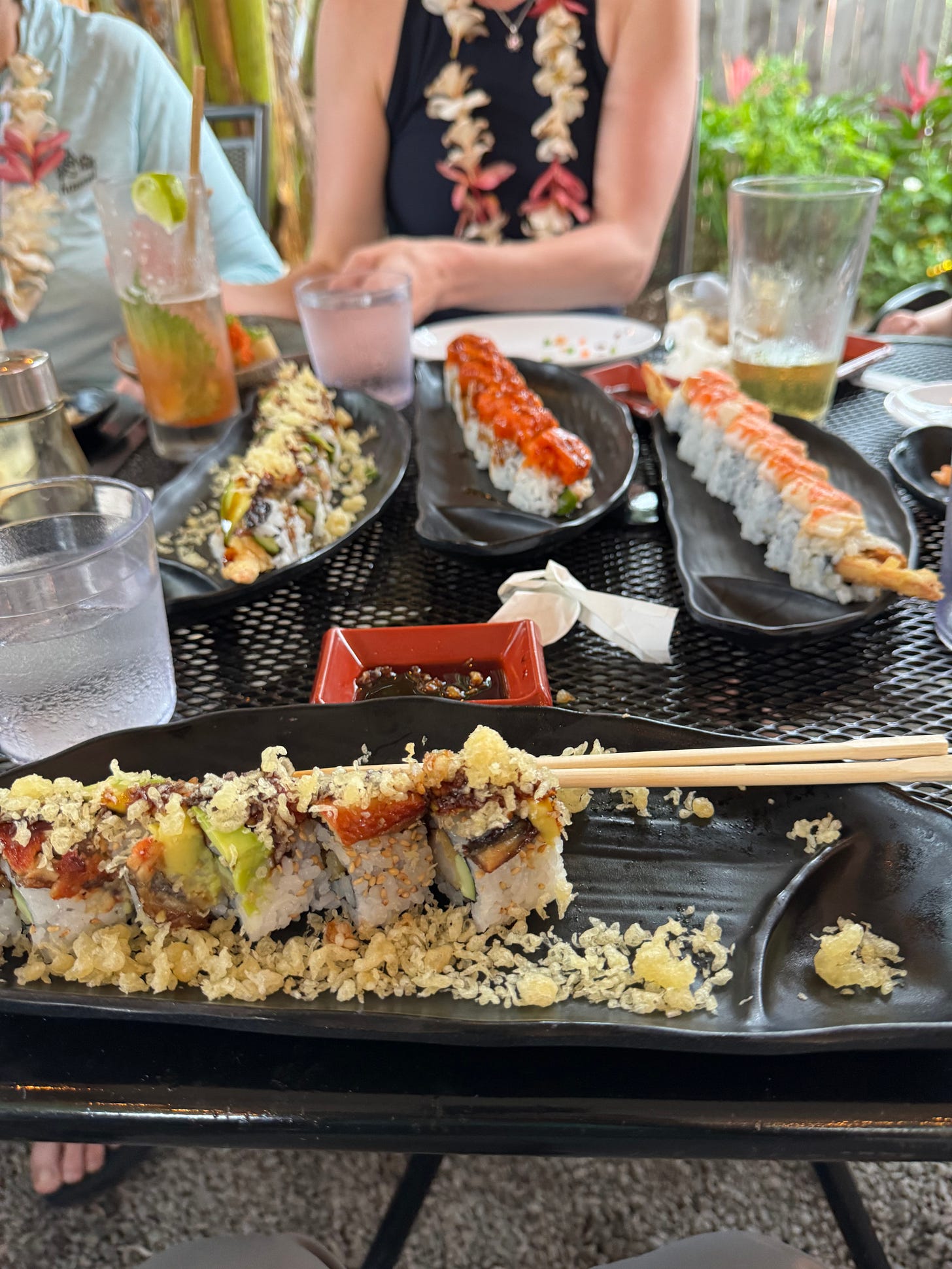 Grandma’s sushi was wonderful, served outside under an awning as the gentle warm rains nourished the Garden Island. We vowed to return on Friday for Hanapepe Art Night.