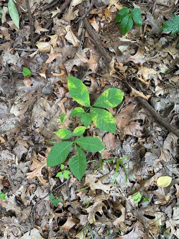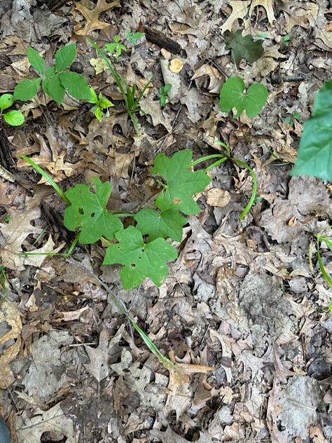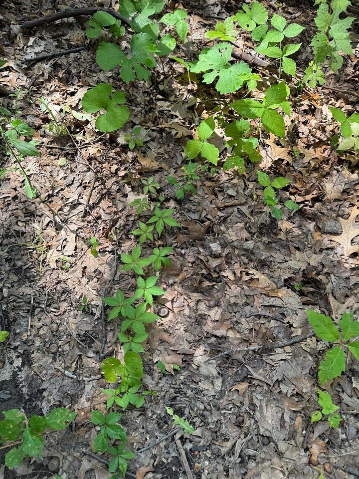 On the left you can see the five-leaved Virginia Creeper, wild grape on the upper left, and a young oak on the bottom right, but also some PI in the upper right and of course in the right photo as well.