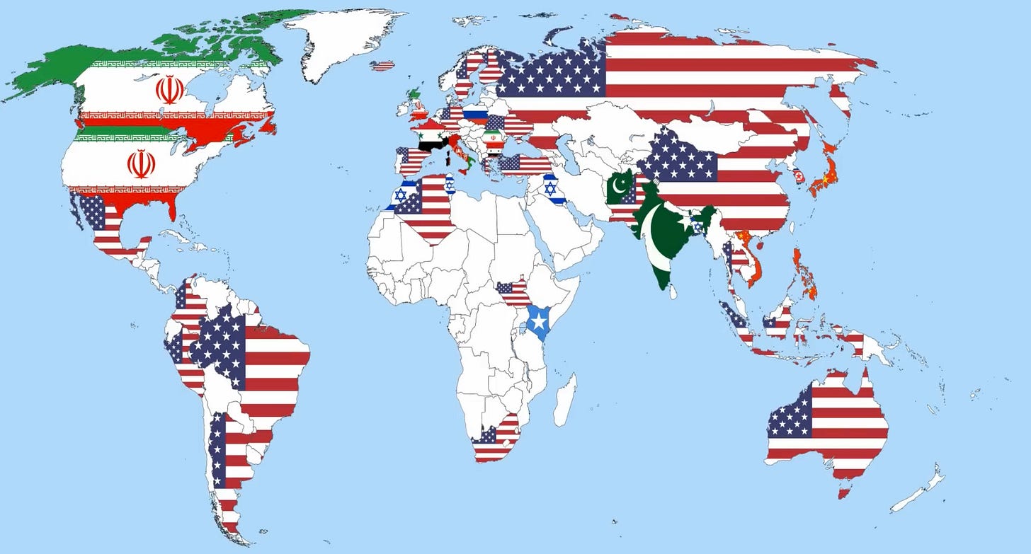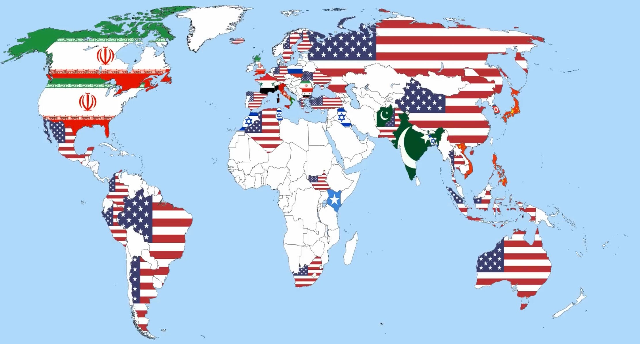 The above map reflects the results of a 2016 poll of people in countries around the world who were asked which country represented the greatest threat to world peace.
