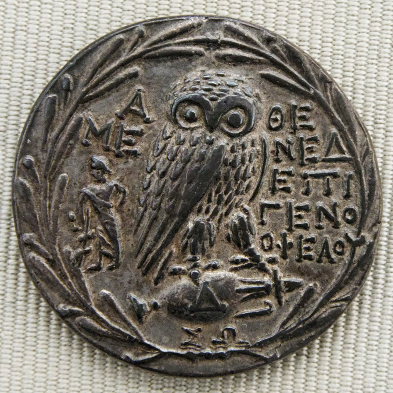 Above: The owl of Athena, symbol of wisdom, surrounded by an olive wreath. Reverse of an Athenian silver tetradrachm, c. 175 BC