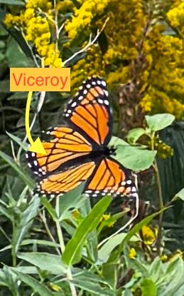 50% of those voting correctly identified the Monarch, and 83% correctly chose the Viceroy. Above you can see them side by side. It’s not the color difference. That can vary by age, light and other variables. Look for a black line running across the bottom of the lower wing, denoted by the yellow arrow. If you see the black line, it’s a Viceroy. If not, it’s a Monarch.