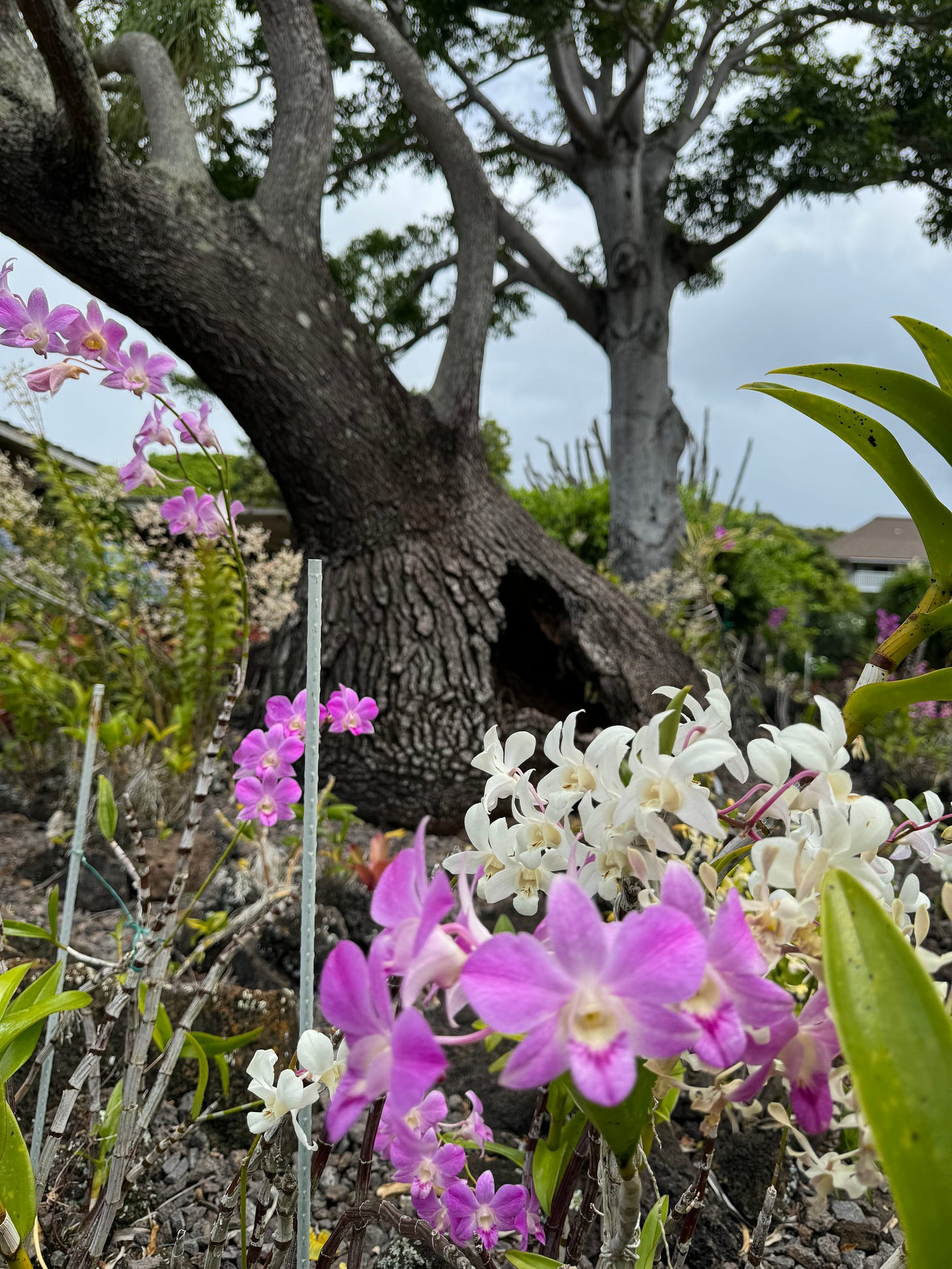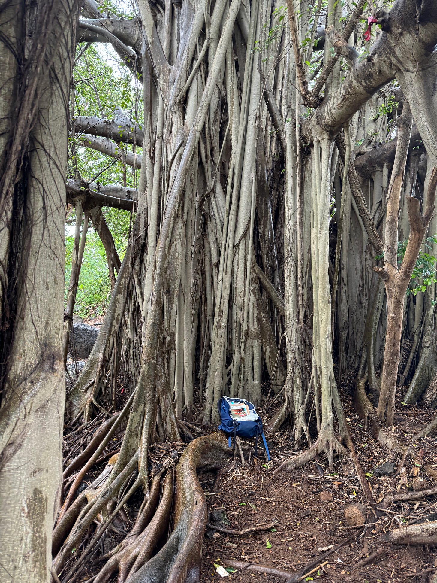 I remembered a big banyan tree just ahead along the banks of the Waikomo Stream and found it. It seemed a perfect spot to wait out the storm.